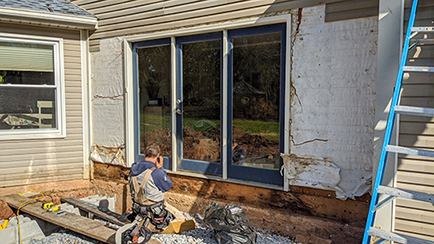 During an inspection of a back patio door, we discovered a water leakage that had affected the deck. Although the homeowners were eager to create a beautiful patio system, we had to pause the project due to the issues we uncovered. The customer reached out to us after a hardscape contractor identified the water damage. We soon realized that the original people who installed the deck had secured it directly through the vinyl siding and ran bolts right through it, a method that should be avoided.